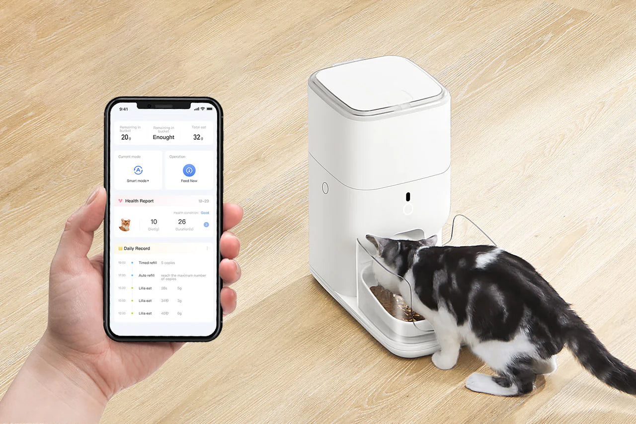 Automatic pet feeder that allows you to set portion-controlled meal schedules through the app.
